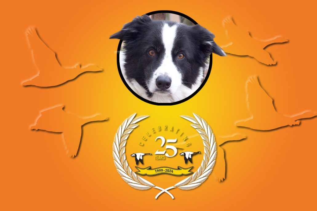 Geese Chasers Border Collie with 25 years anniversary badge 1999–2024